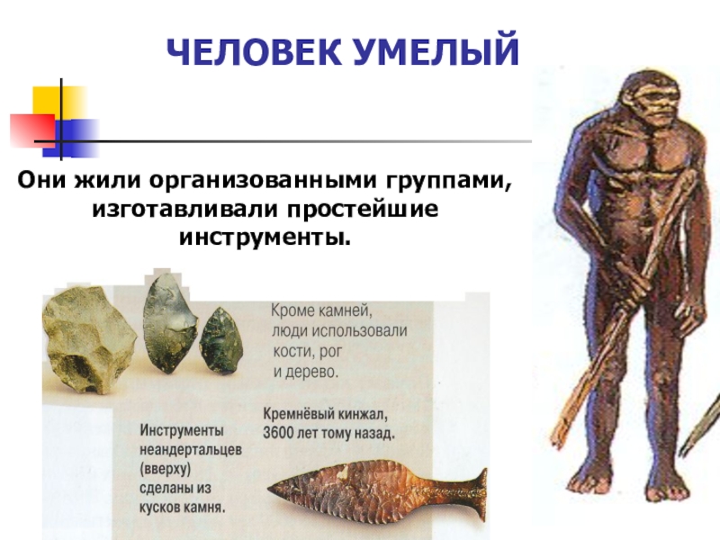 ЧЕЛОВЕК УМЕЛЫЙОни жили организованными группами, изготавливали простейшие инструменты.