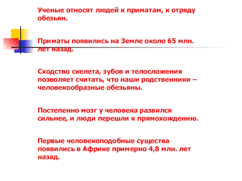 Ученые относят людей к приматам, к отряду обезьян.Приматы появились на Земле около 65 млн. лет назад.Сходство скелета,