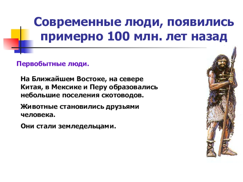 Современные люди, появились примерно 100 млн. лет назадПервобытные люди.На Ближайшем Востоке, на севере Китая, в Мексике и