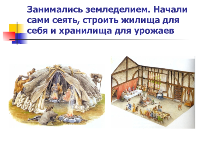 Слайд 11Занимались земледелием. Начали сами сеять, строить жилища для себя и хранилища
