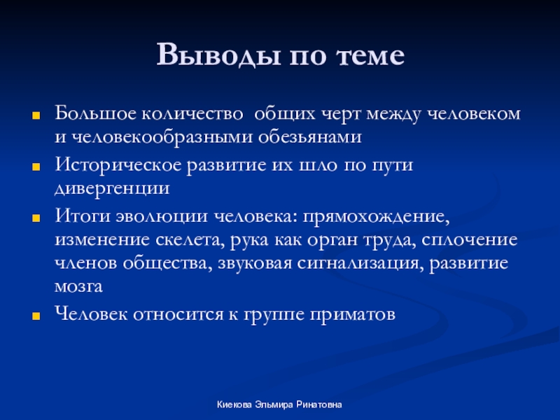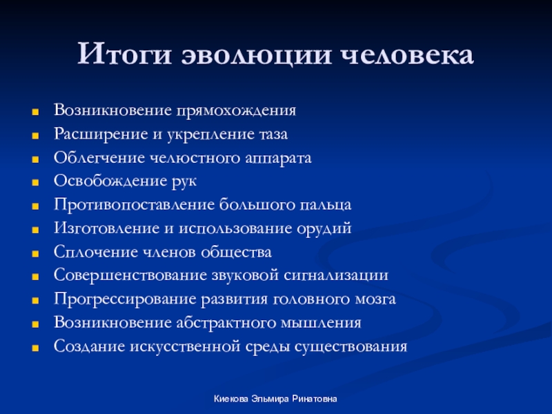 Итоги эволюции человека: прямохождение, изменение скелета, рука как орган труда, сплочение членов общества, звуковая сигнализация, развитие мозга