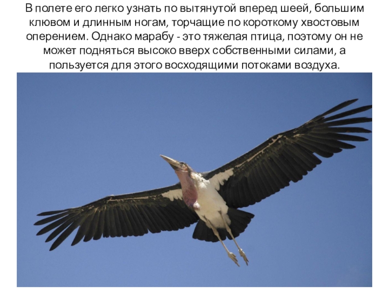 и длинным ногам, торчащие по короткому хвостовым оперением. Однако марабу - это тяжелая птица, поэтому он не может подняться высоко вверх собственными силами, а пользуется для этого восходящими потоками воздуха.