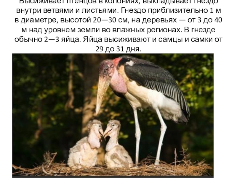 Слайд 9Высиживает птенцов в колониях, выкладывает гнездо внутри ветвями и листьями. Гнездо