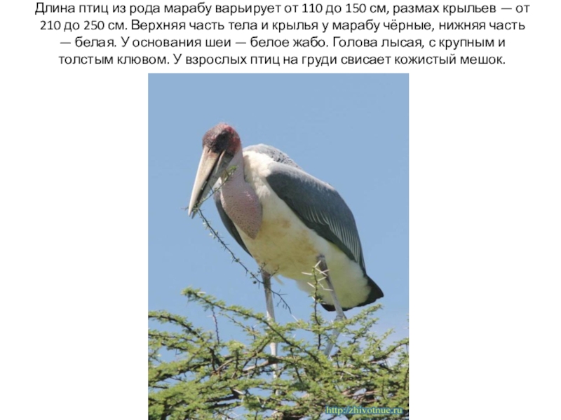 Слайд 4Длина птиц из рода марабу варьирует от 110 до 150 см,