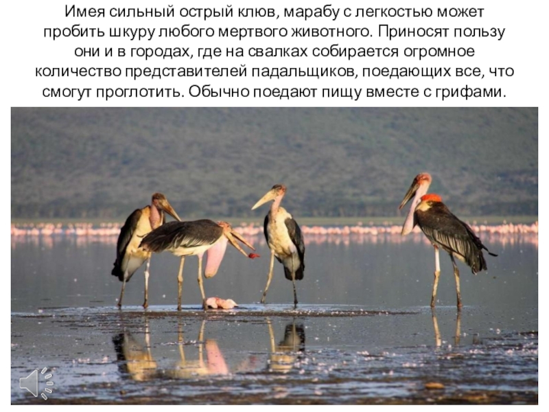 Слайд 7Имея сильный острый клюв, марабу с легкостью может пробить шкуру любого