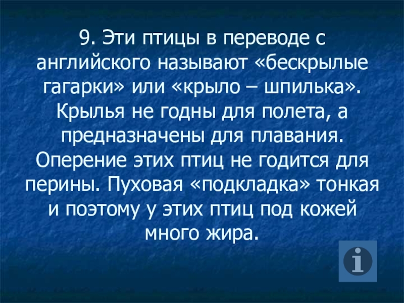 9. Эти птицы в переводе с английского называют «бескрылые гагарки» или «крыло – шпилька». Крылья не годны