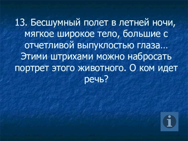 Слайд 16 13. Бесшумный полет в летней ночи, мягкое широкое тело, большие
