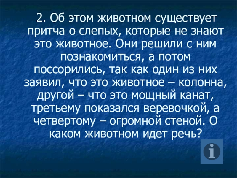 Слайд 4 2. Об этом животном существует притча о слепых, которые