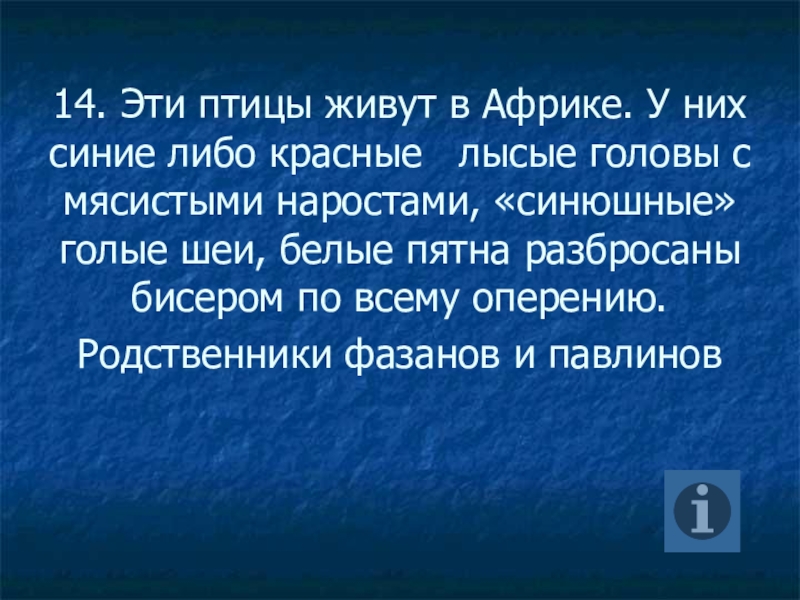 14. Эти птицы живут в Африке. У них синие либо красные  лысые головы с мясистыми наростами,
