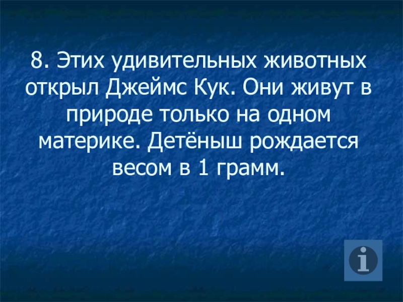 8. Этих удивительных животных открыл Джеймс Кук. Они живут в природе только на одном материке. Детёныш рождается