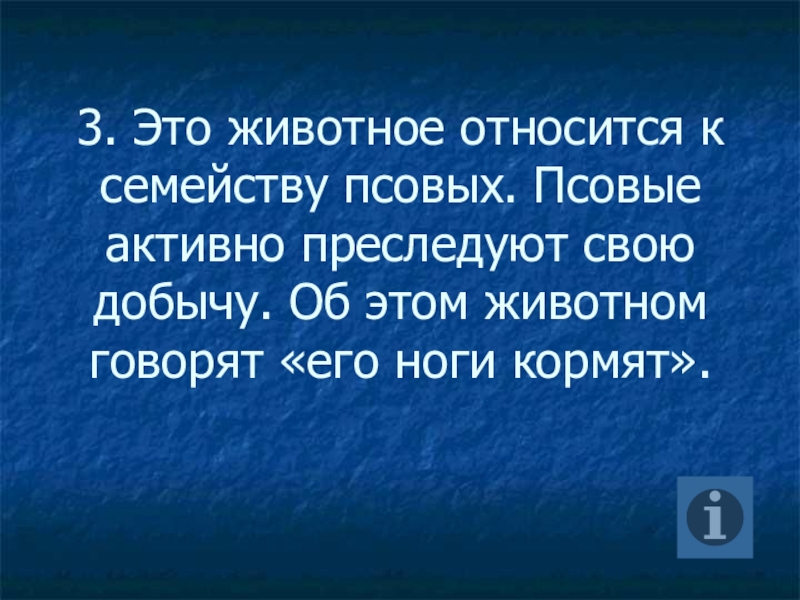3. Это животное относится к семейству псовых. Псовые активно преследуют свою добычу. Об этом животном говорят «его