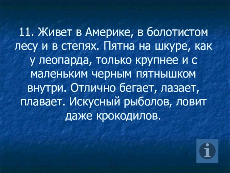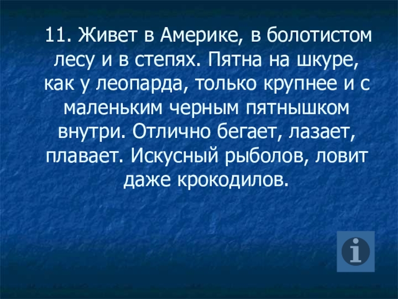 11. Живет в Америке, в болотистом лесу и в степях. Пятна на шкуре, как у леопарда, только