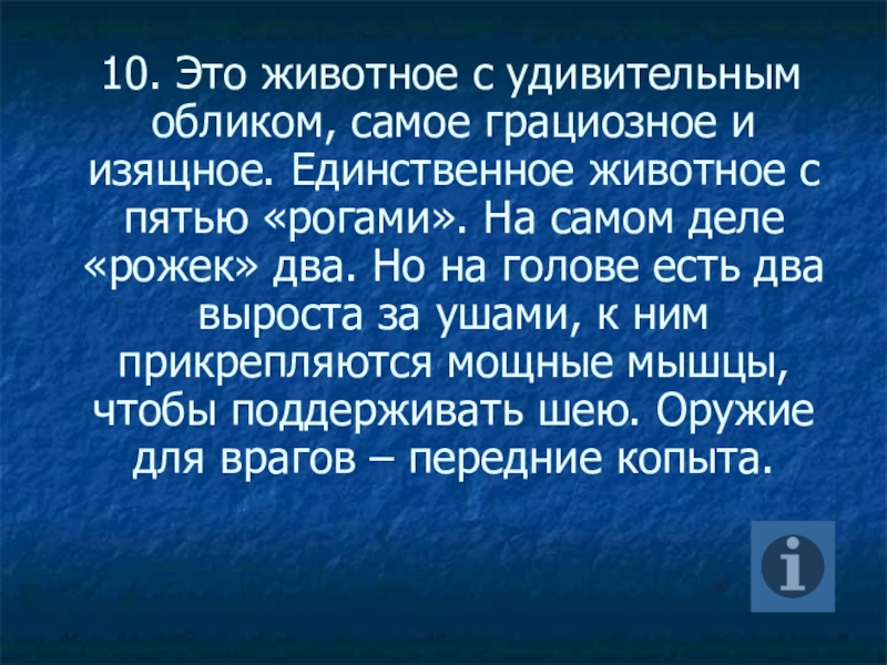 Слайд 12 10. Это животное с удивительным обликом, самое грациозное и