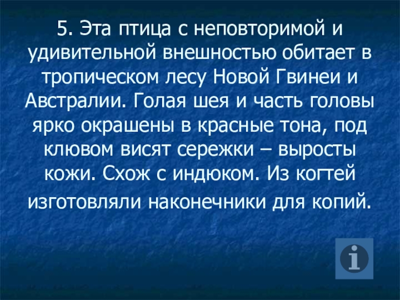 Слайд 75. Эта птица с неповторимой и удивительной внешностью обитает в тропическом