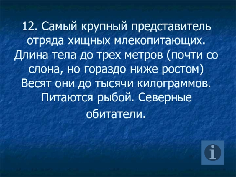 Слайд 1512. Самый крупный представитель отряда хищных млекопитающих. Длина тела до трех