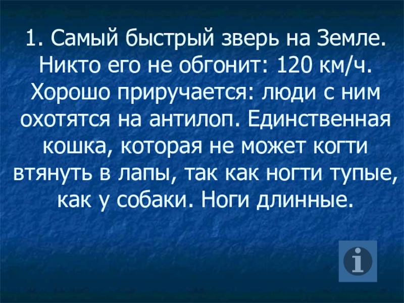 1. Самый быстрый зверь на Земле. Никто его не обгонит: 120 км/ч. Хорошо приручается: люди с ним