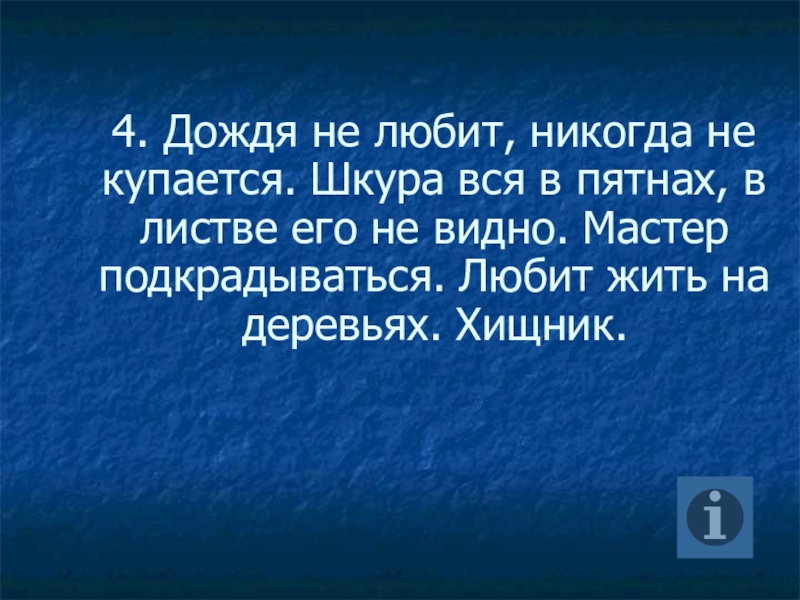 4. Дождя не любит, никогда не купается. Шкура вся в пятнах, в листве его не видно.