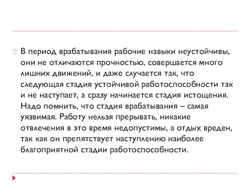 Слайд 8В период врабатывания рабочие навыки неустойчивы, они не отличаются прочностью, совершается