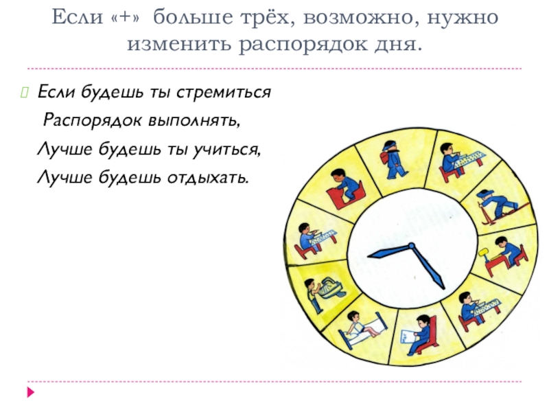 Слайд 14Если «+» больше трёх, возможно, нужно изменить распорядок дня.
