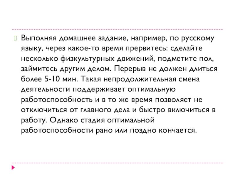 Слайд 10Выполняя домашнее задание, например, по русскому языку, через какое-то время прервитесь: