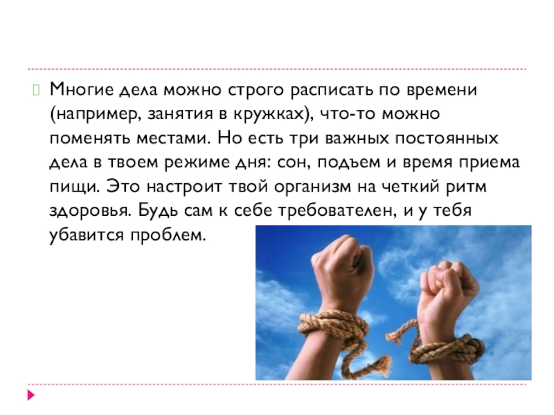 что-то можно поменять местами. Но есть три важных постоянных дела в твоем режиме дня: сон, подъем и время приема пищи. Это настроит твой организм на четкий ритм здоровья. Будь сам к себе требователен, и у тебя убавится проблем.