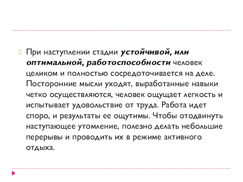 Слайд 9При наступлении стадии устойчивой, или оптимальной, работоспособности человек целиком и полностью