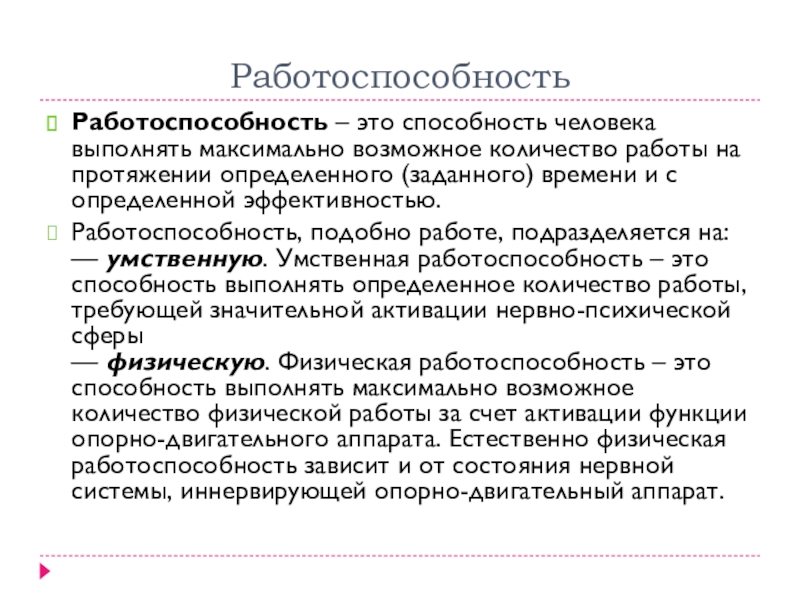 Работоспособность – это способность человека выполнять максимально возможное количество работы на