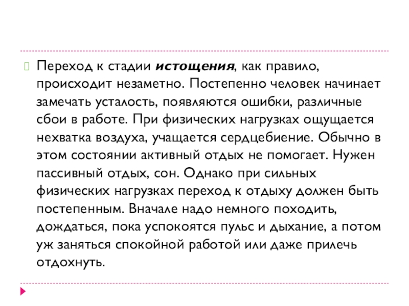 замечать усталость, появляются ошибки, различные сбои в работе. При физических нагрузках ощущается нехватка воздуха, учащается сердцебиение. Обычно в этом состоянии активный отдых не помогает. Нужен пассивный отдых, сон. Однако при сильных физических нагрузках переход к отдыху должен быть постепенным. Вначале надо немного походить, дождаться, пока успокоятся пульс и дыхание, а потом уж заняться спокойной работой или даже прилечь отдохнуть.