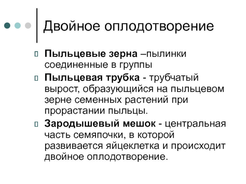 Двойное оплодотворениеПыльцевые зерна –пылинки соединенные в группыПыльцевая трубка - трубчатый вырост, образующийся на пыльцевом зерне семенных растений при прорастании