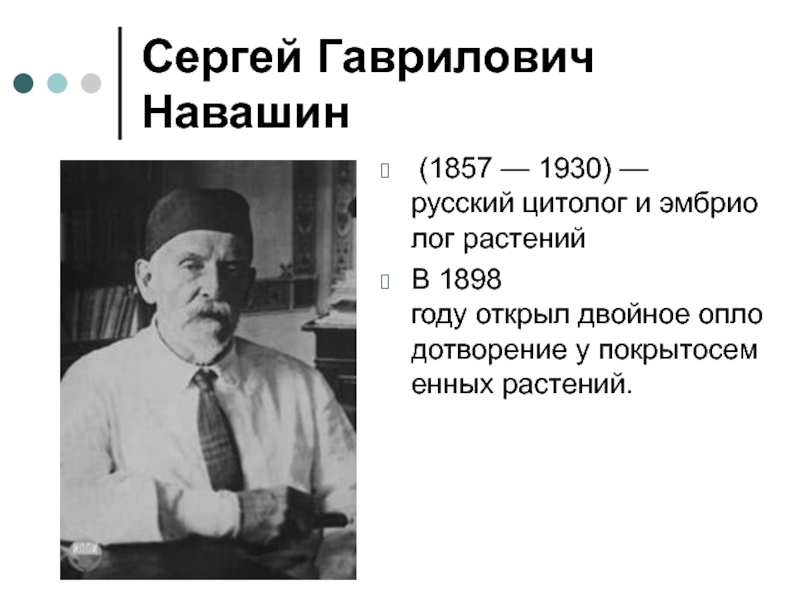 Сергей Гаврилович Навашин  (1857 — 1930) — русский цитолог и эмбриолог растенийВ 1898 году открыл двойное оплодотворение у покрытосеменных растений.