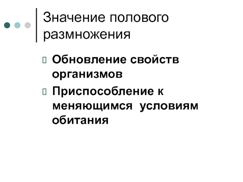 Значение полового размноженияОбновление свойств организмовПриспособление к меняющимся условиям обитания