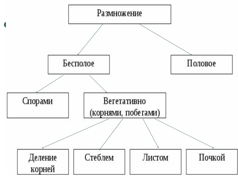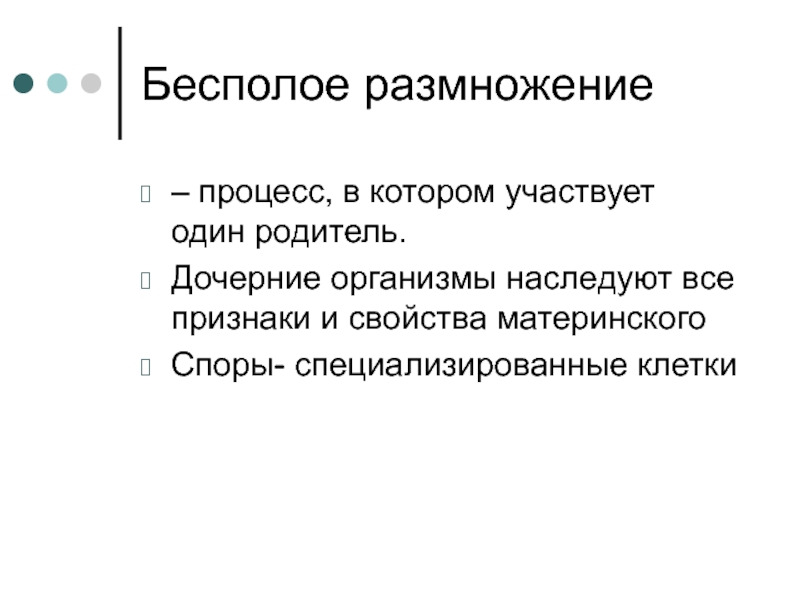 Бесполое размножение– процесс, в котором участвует один родитель.Дочерние организмы наследуют все признаки и свойства материнскогоСпоры- специализированные клетки