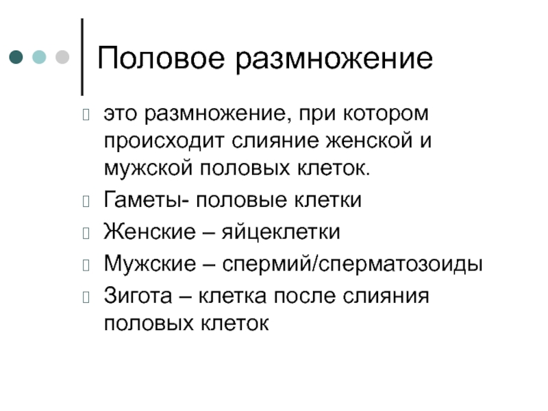 Половое размножениеэто размножение, при котором происходит слияние женской и мужской половых клеток. Гаметы- половые клеткиЖенские – яйцеклеткиМужские