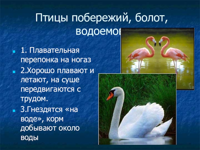 Птицы побережий, болот, водоемов1. Плавательная перепонка на ногаз2.Хорошо плавают и летают, на суше передвигаются с трудом.3.Гнездятся