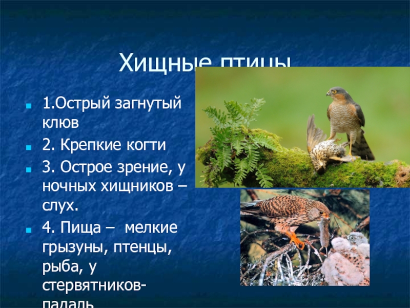 Хищные птицы1.Острый загнутый клюв2. Крепкие когти3. Острое зрение, у ночных хищников – слух.4. Пища – мелкие грызуны, птенцы, рыба, у стервятников- падаль
