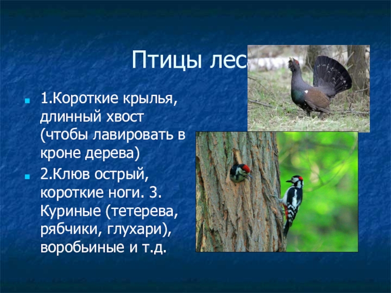 Птицы леса1.Короткие крылья, длинный хвост (чтобы лавировать в кроне дерева) 2.Клюв острый, короткие ноги. 3.Куриные (тетерева, рябчики,
