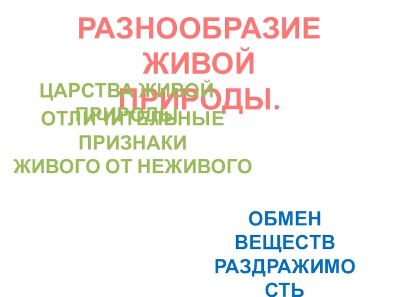 РАЗНООБРАЗИЕ ЖИВОЙПРИРОДЫ.ЦАРСТВА ЖИВОЙ ПРИРОДЫОТЛИЧИТЕЛЬНЫЕ ПРИЗНАКИ ЖИВОГО ОТ НЕЖИВОГООБМЕН ВЕЩЕСТВРАЗДРАЖИМОСТЬРОСТ