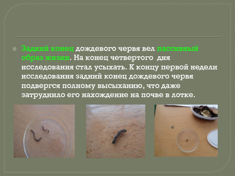 дня исследования стал усыхать. К концу первой недели исследования задний конец дождевого червя подвергся полному высыханию, что даже затруднило его нахождение на почве в лотке.