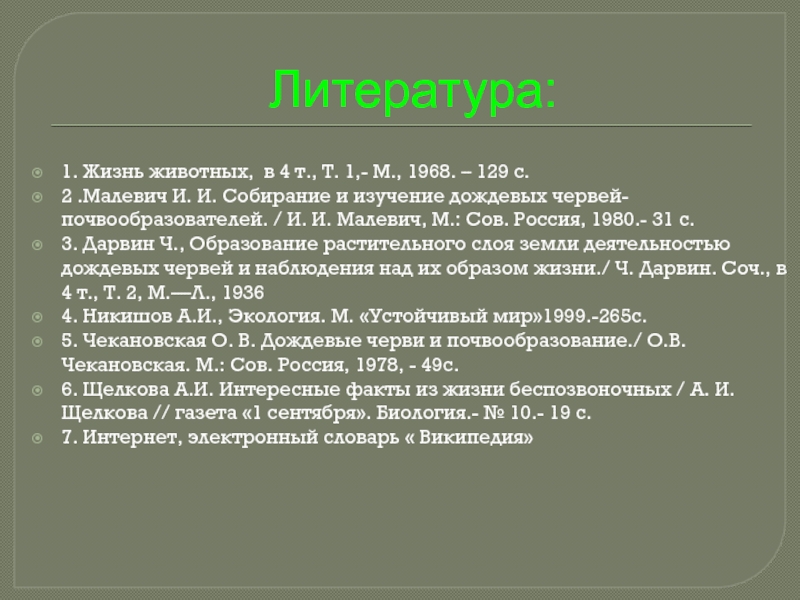 2 .Малевич И. И. Собирание и изучение дождевых червей- почвообразователей. / И. И. Малевич, М.: Сов. Россия, 1980.- 31 с.