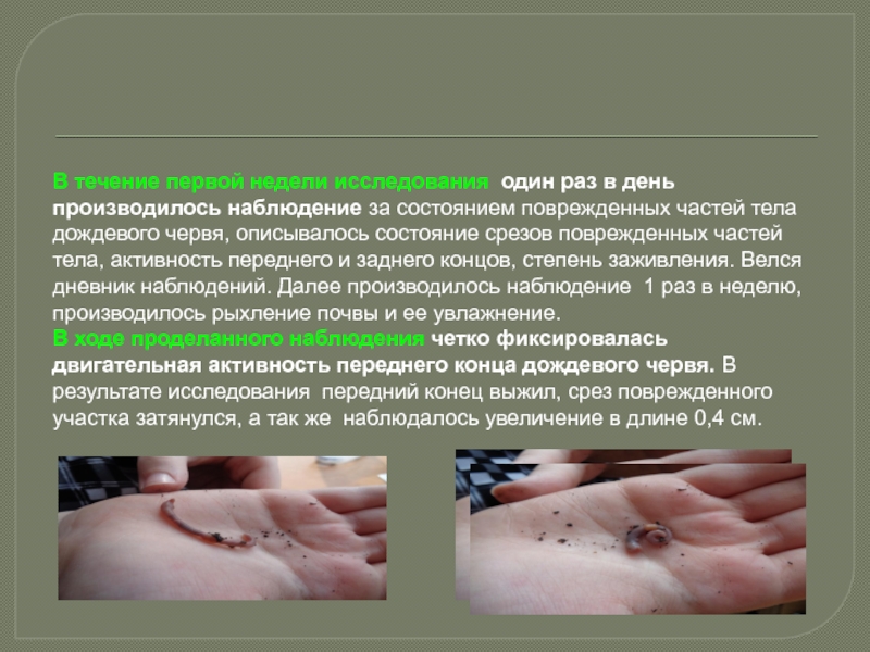за состоянием поврежденных частей тела дождевого червя, описывалось состояние срезов поврежденных частей тела, активность переднего и заднего концов, степень заживления. Велся дневник наблюдений. Далее производилось наблюдение 1 раз в неделю, производилось рыхление почвы и ее увлажнение.