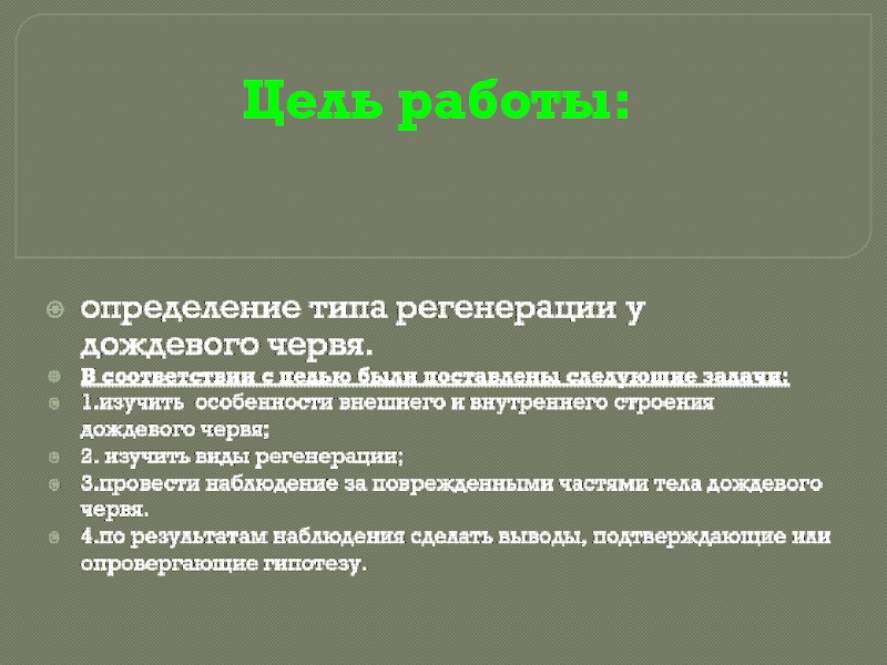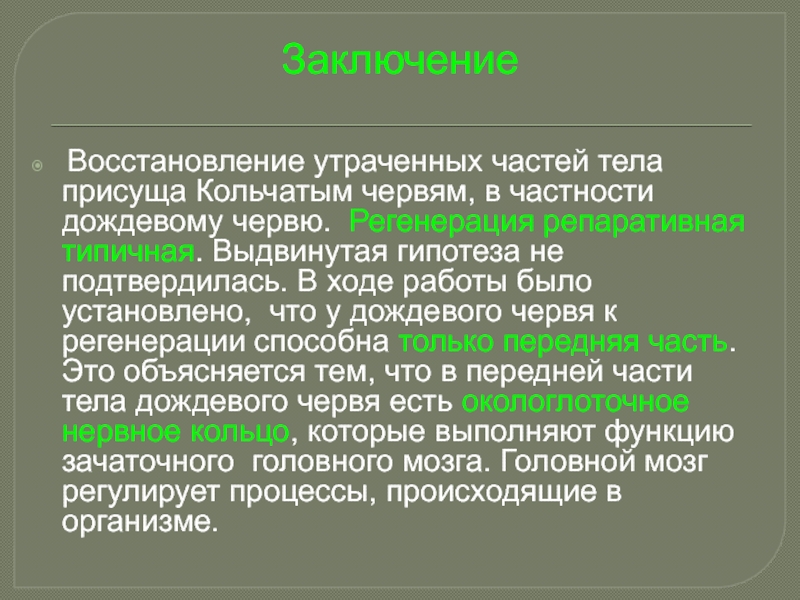 червю. Регенерация репаративная типичная. Выдвинутая гипотеза не подтвердилась. В ходе работы было установлено, что у дождевого червя к регенерации способна только передняя часть. Это объясняется тем, что в передней части тела дождевого червя есть окологлоточное нервное кольцо, которые выполняют функцию зачаточного головного мозга. Головной мозг регулирует процессы, происходящие в организме.