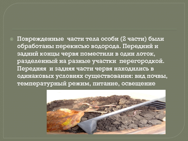 и задний концы червя поместили в один лоток, разделенный на разные участки перегородкой. Передняя и задняя части червя находились в одинаковых условиях существования: вид почвы, температурный режим, питание, освещение