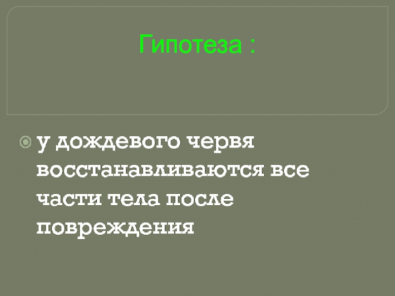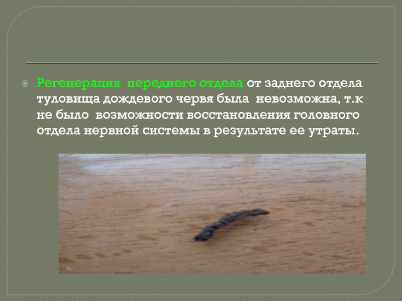 Слайд 9Регенерация переднего отдела от заднего отдела туловища дождевого червя была невозможна,