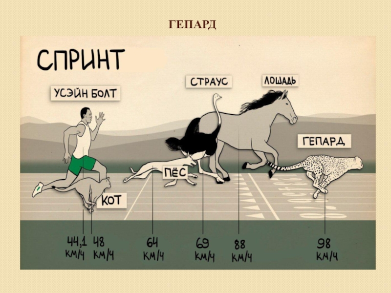 кошачьих, но и всех животных в мире! Всего за три секунды гепард способен разбежаться до 112 км/ч. Максимальный разбег на короткие дистанции составляет 130 км/ч. Он обладает стройным, изящным телом и отлично развитой мускулатурой. У крупного хищника вес максимум достигает лишь 65 килограмм. . При максимальном забеге у этого хищника частота дыхания развивается до 150-ти раз в минуту. Помимо всего, гепард способен молниеносно изменить направление бега. Таким образом, у жертвы охотника не остается практически ни малейших шансов на выживание.