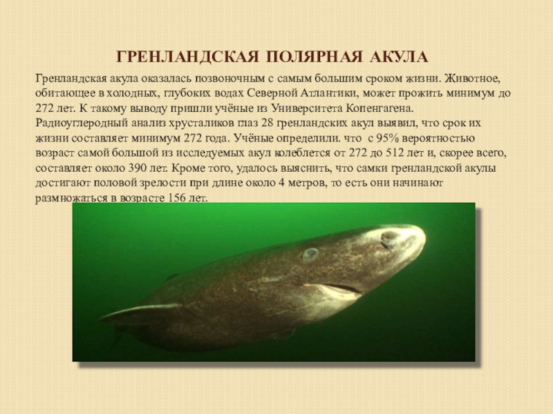 жизни. Животное, обитающее в холодных, глубоких водах Северной Атлантики, может прожить минимум до 272 лет. К такому выводу пришли учёные из Университета Копенгагена.