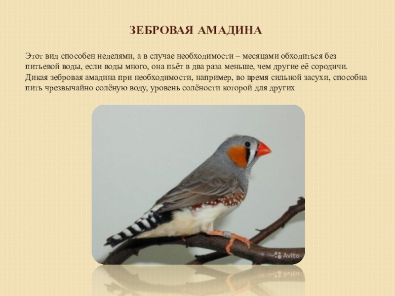 обходиться без питьевой воды, если воды много, она пьёт в два раза меньше, чем другие её сородичи. Дикая зебровая амадина при необходимости, например, во время сильной засухи, способна пить чрезвычайно солёную воду, уровень солёности которой для других