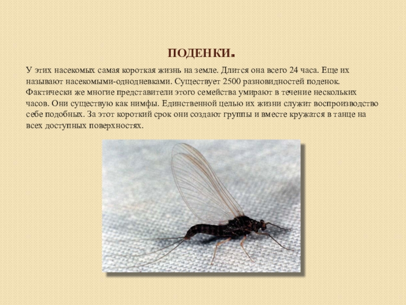 всего 24 часа. Еще их называют насекомыми-однодневками. Существует 2500 разновидностей поденок. Фактически же многие представители этого семейства умирают в течение нескольких часов. Они существую как нимфы. Единственной целью их жизни служит воспроизводство себе подобных. За этот короткий срок они создают группы и вместе кружатся в танце на всех доступных поверхностях.