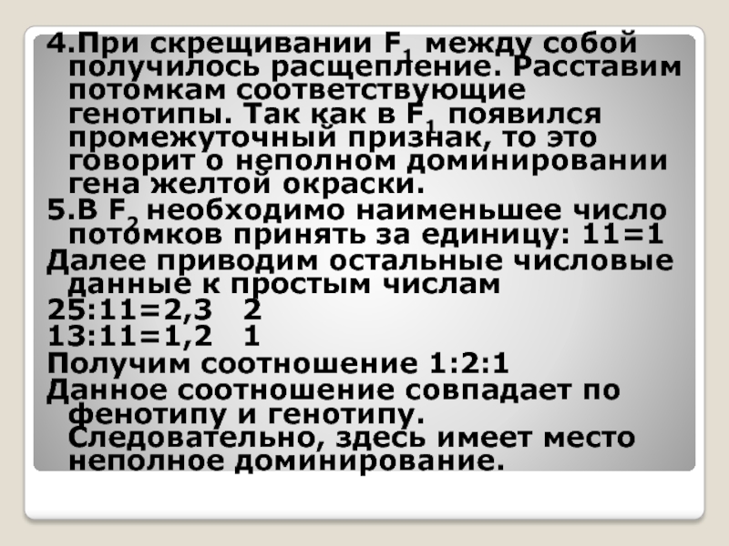 4.При скрещивании F1 между собой получилось расщепление. Расставим потомкам соответствующие генотипы. Так как в F1 появился промежуточный
