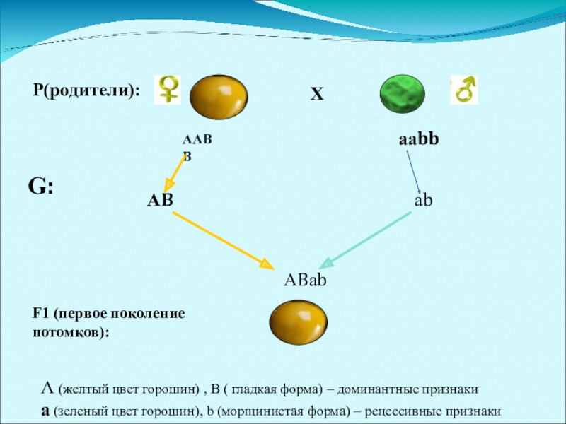 А (желтый цвет горошин) , B ( гладкая форма) – доминантные признаки