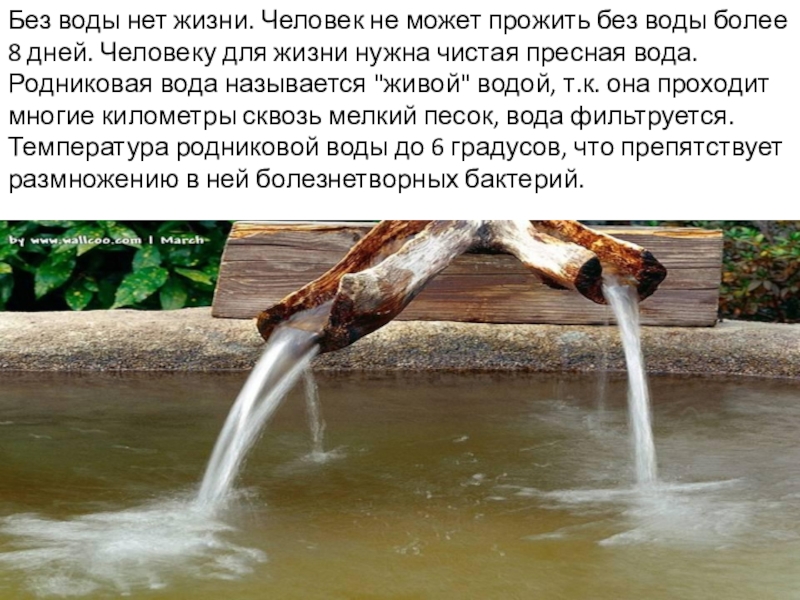 8 дней. Человеку для жизни нужна чистая пресная вода. Родниковая вода называется "живой" водой, т.к. она проходит многие километры сквозь мелкий песок, вода фильтруется. Температура родниковой воды до 6 градусов, что препятствует размножению в ней болезнетворных бактерий.